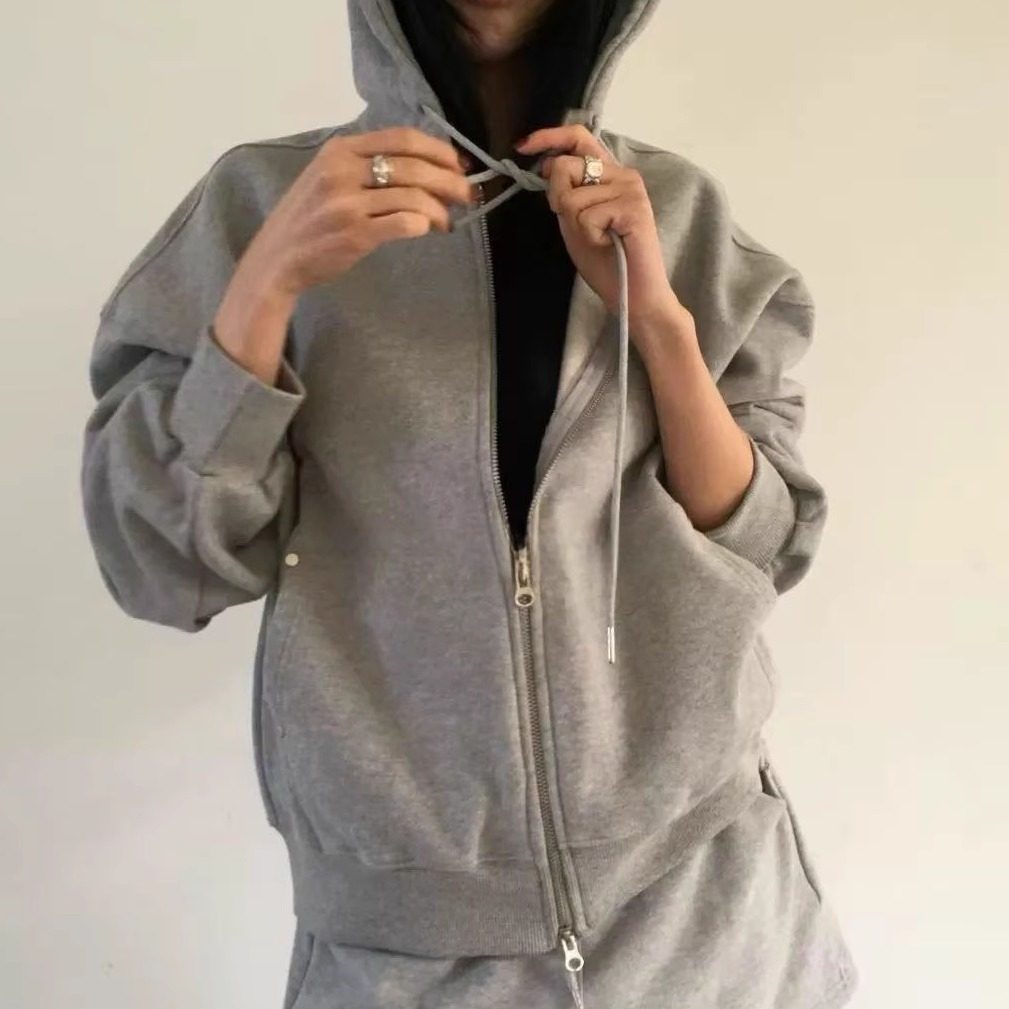 墨尔本~韩系灰色慵懒连帽拉链卫衣女宽松舒适休闲运动外套上衣秋