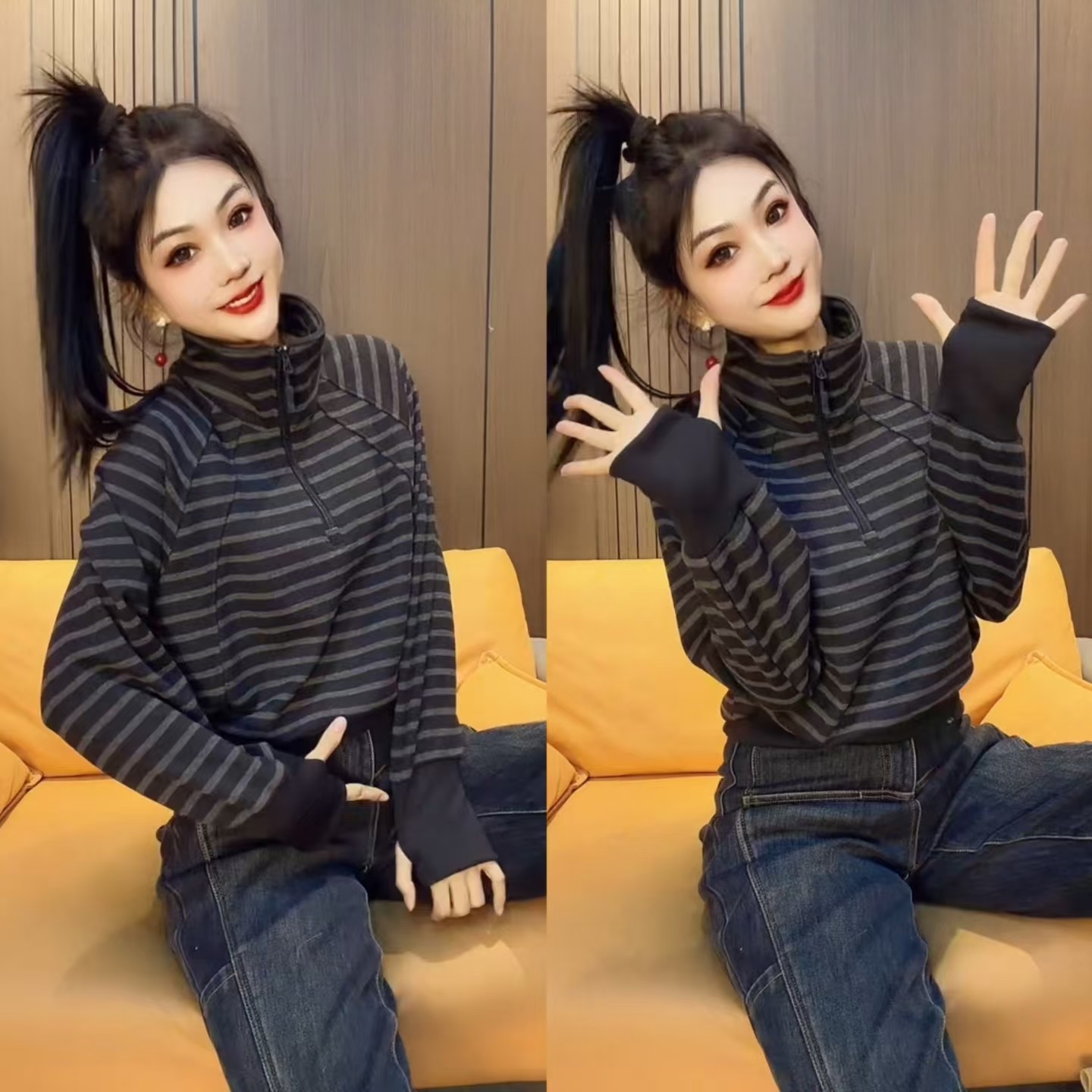 时尚短款条纹半拉链卫衣女宽松立领长袖通勤休闲上衣2025年秋冬