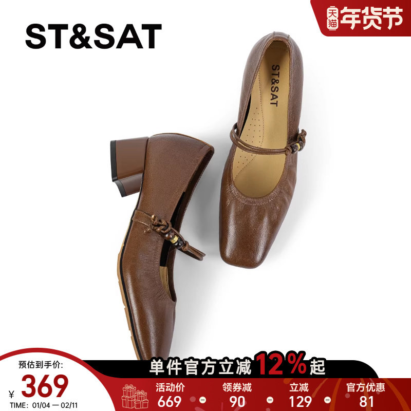 星期六棕色玛丽珍鞋女2025真皮浅口方头单鞋粗跟英伦复古中跟女鞋