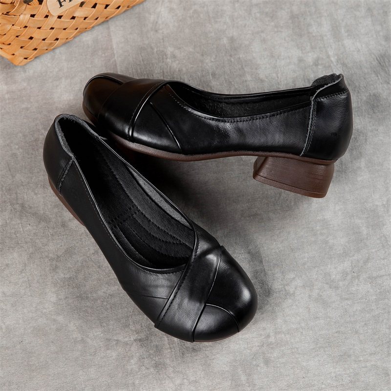 2025春秋新款真皮浅口女单鞋粗跟中跟舒适工作鞋圆头牛筋底舞蹈鞋