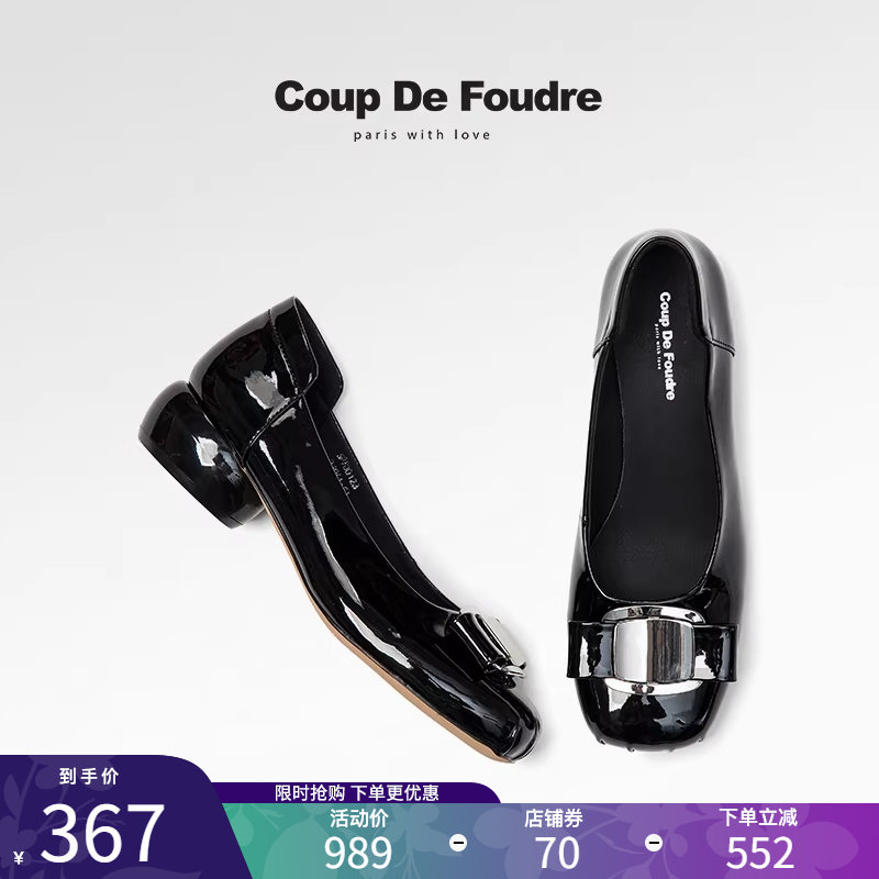 CDF女鞋轻奢秋季法式百搭真皮漆皮圆头浅口中跟粗跟通勤套脚单鞋