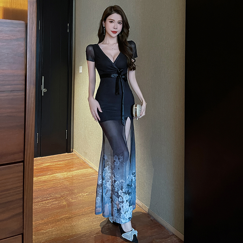 夜总店性感连衣裙长款晚礼服气质网纱改良旗袍柔式足浴技师工作服