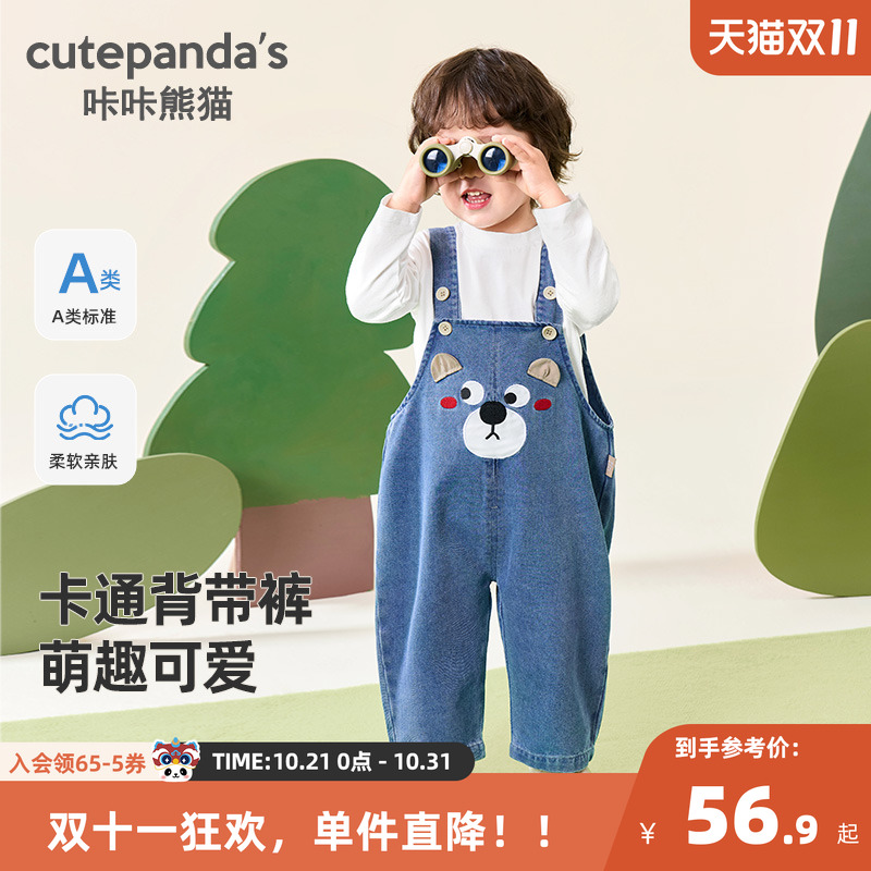 咔咔熊猫男童裤子春秋婴儿童卡通休闲牛仔背带裤春装女童长裤宝宝