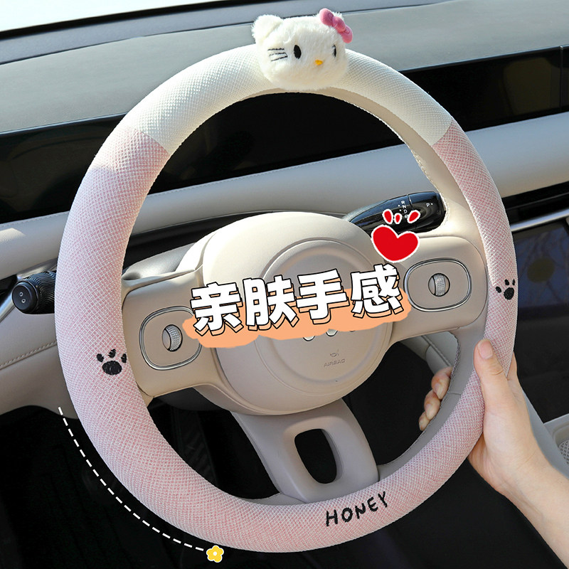 可爱汽车方向盘套四季通用亚麻kt猫卡通夏季防滑吸汗女生高级装饰