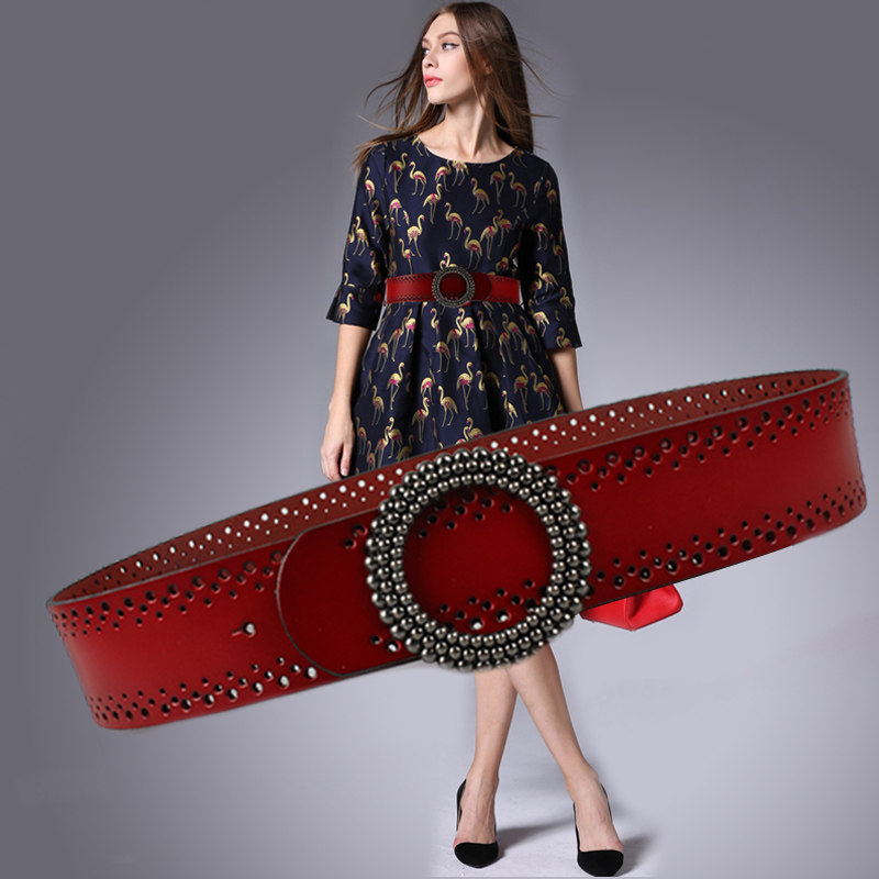 复古圆扣真皮宽h腰带女士连衣裙镂空装饰皮带女简约百搭纯牛皮腰