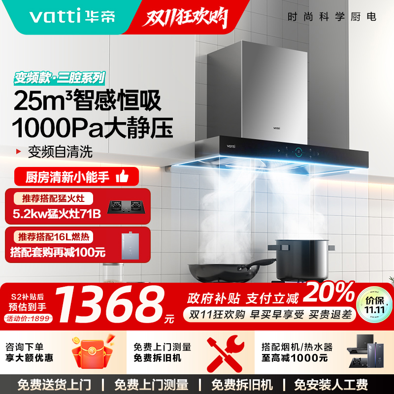 国补华帝燃气灶套餐S2三腔油烟机套装家用厨房自动洗欧式烟机套装