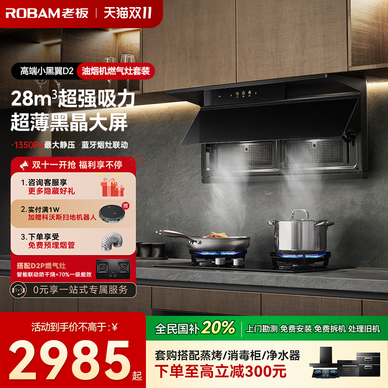 【老板油烟机套装】小黑翼D2顶侧双吸厨房智能大吸力烟灶官方旗舰