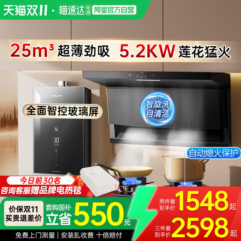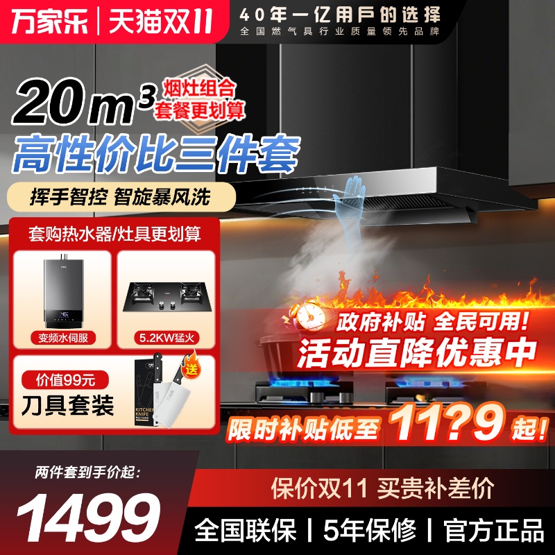 【重磅新品】万和25m³油烟机套装家用厨房三件套烟机灶具热水器