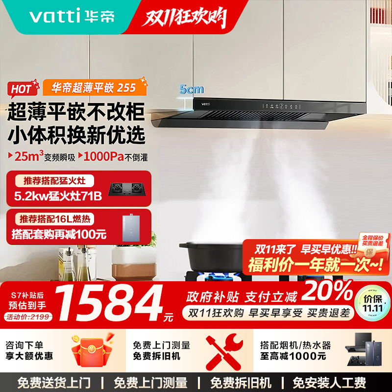 华帝油烟机11255/S7顶吸抽油烟机套装家用厨房变频大吸力官方旗舰