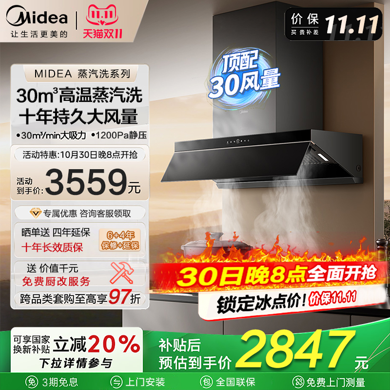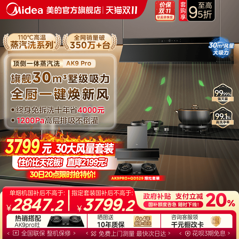 美的蒸汽洗AK9pro吸排抽油烟机家用厨房30风量顶侧一体油烟机套装