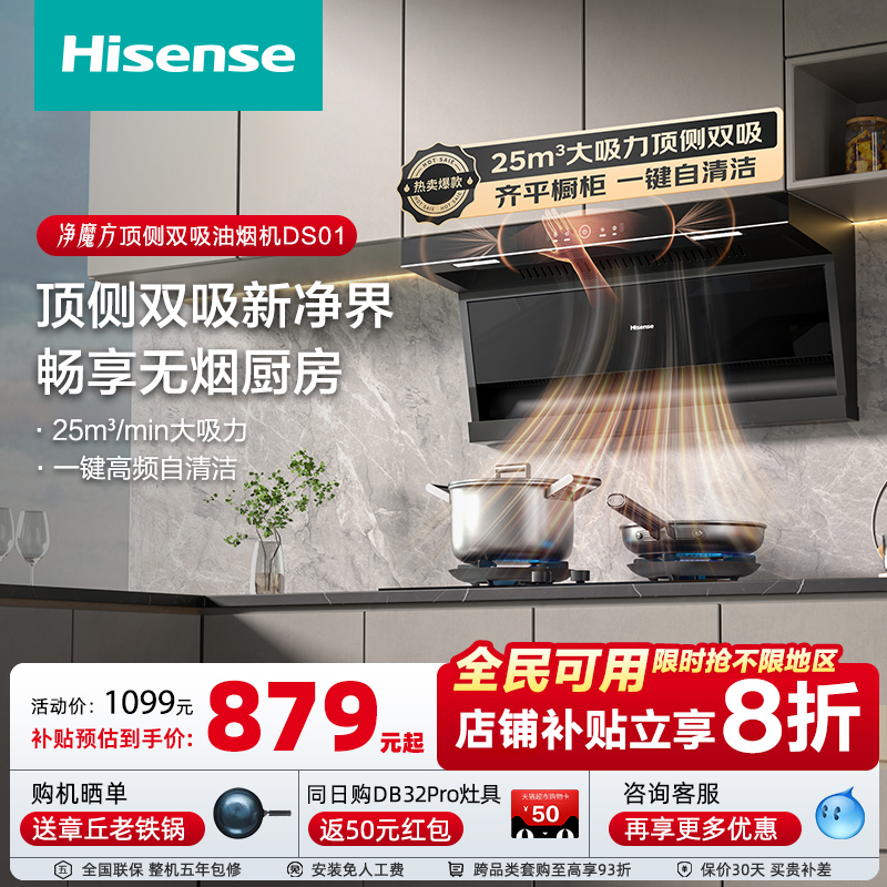 海信纤薄油烟机套装顶侧双吸24m³吸力挥手触控排烟机净魔方DS01