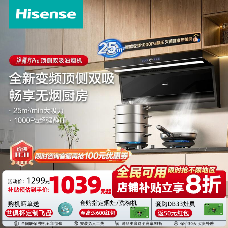 海信吸油烟机套装家用顶侧双吸7字25m³大吸力净魔方变频DS11HPro