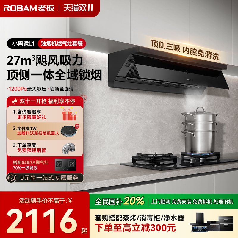 【老板油烟机套装】小黑镜L1抽吸油烟机顶侧一体大吸力官方旗舰