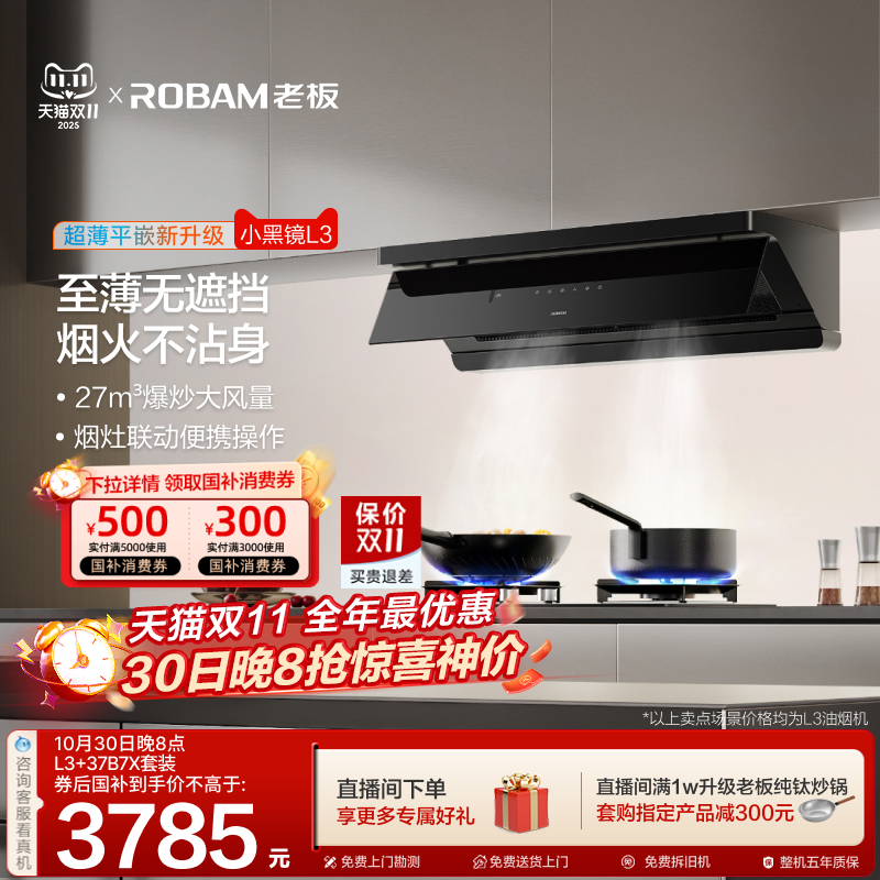 老板超薄平嵌小黑镜L1P大吸力抽油烟机套装家用燃气灶具官方旗舰