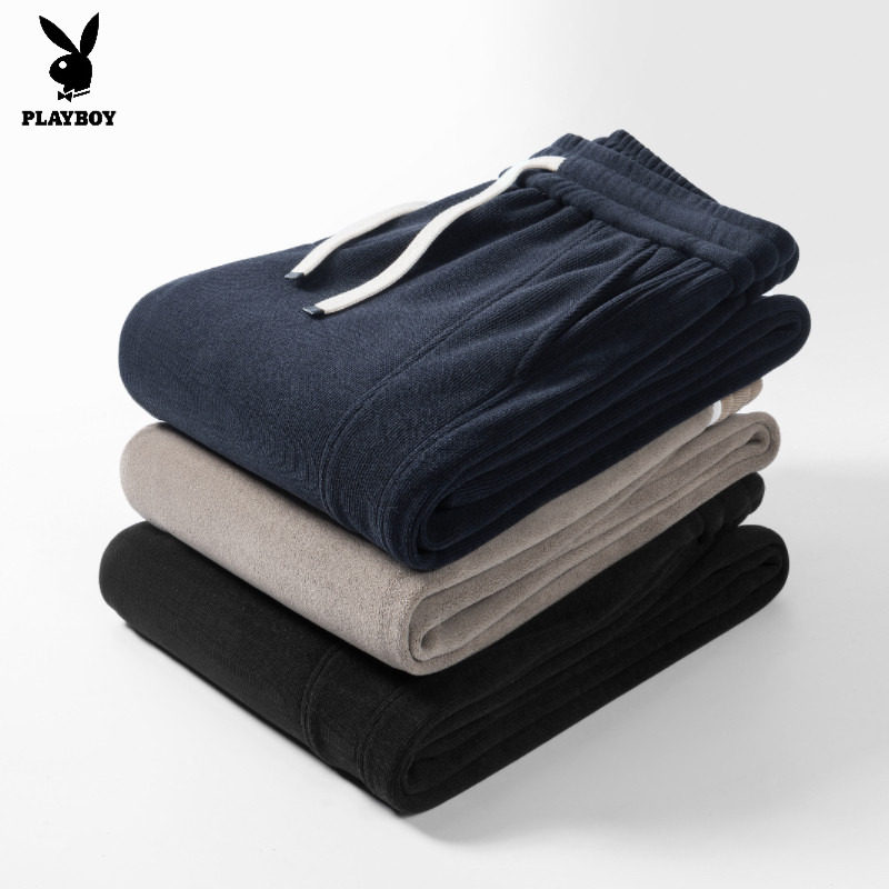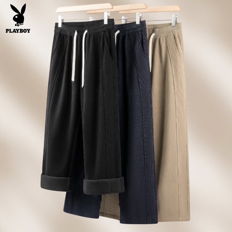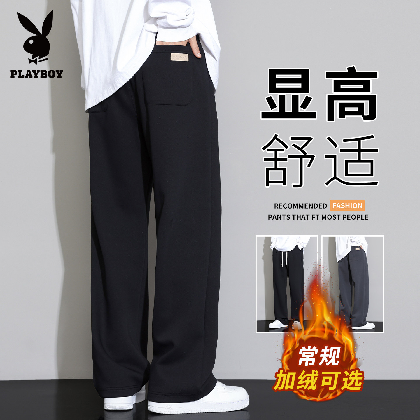 花花公子秋冬季新款卫裤男士运动宽松直筒加绒加厚阔腿休闲长裤子
