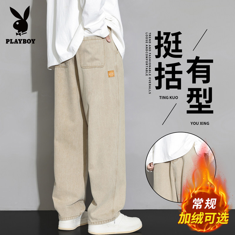 花花公子秋冬季厚款牛仔裤男士新款美式高街宽松直筒休闲加绒裤子