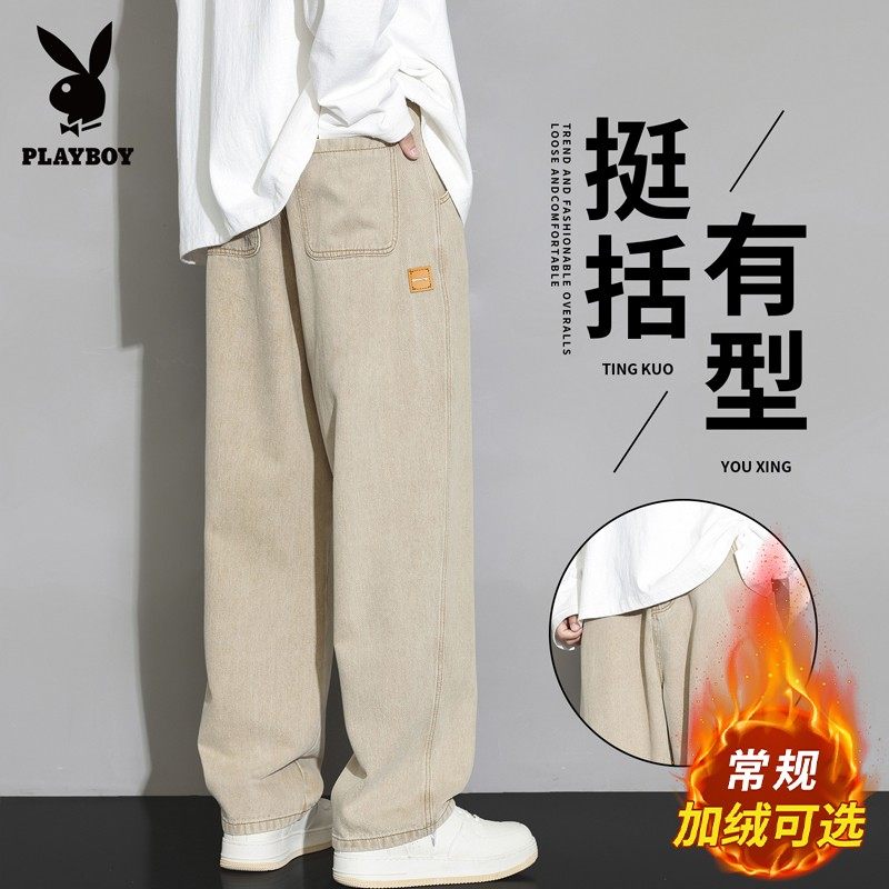 花花公子冬季加绒加厚牛仔裤男款宽松直筒阔腿潮牌百搭休闲长裤子