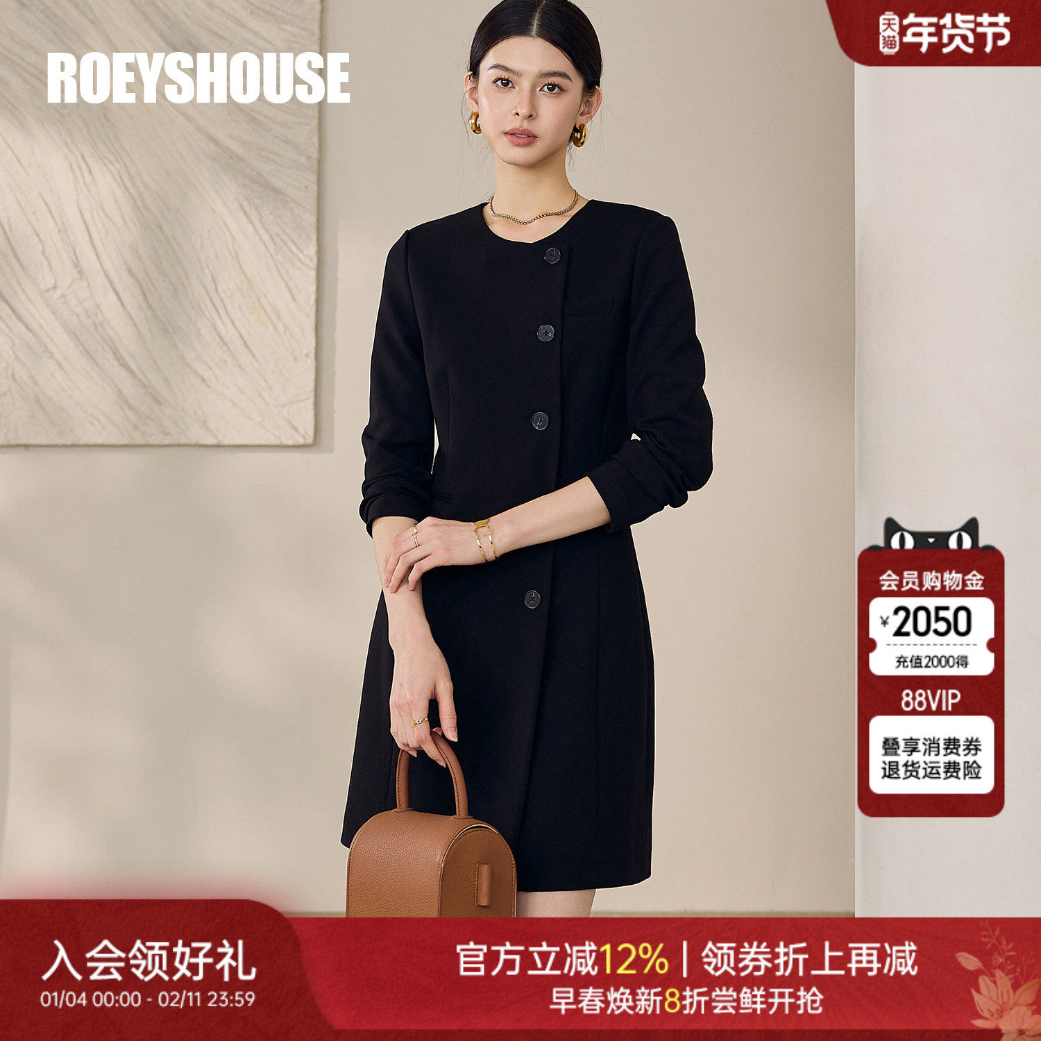 罗衣高级感黑色通勤连衣裙女春季新款休闲职业修身圆领A字裙12579