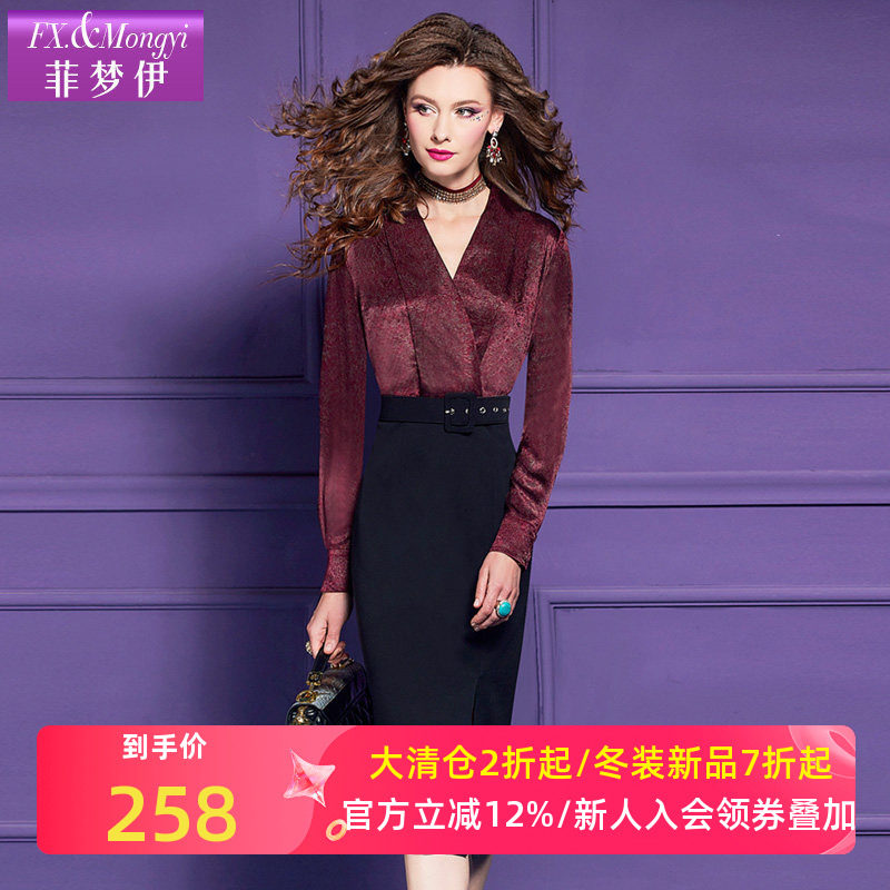 【直播专享】菲梦伊假两件连衣裙女秋装新款气质修身职业开叉裙子