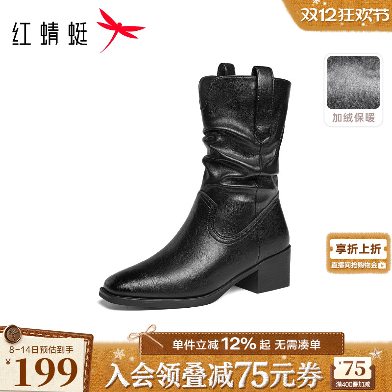 红蜻蜓西部靴2025秋冬新款女鞋一脚蹬套筒中筒靴粗跟加绒保暖女靴