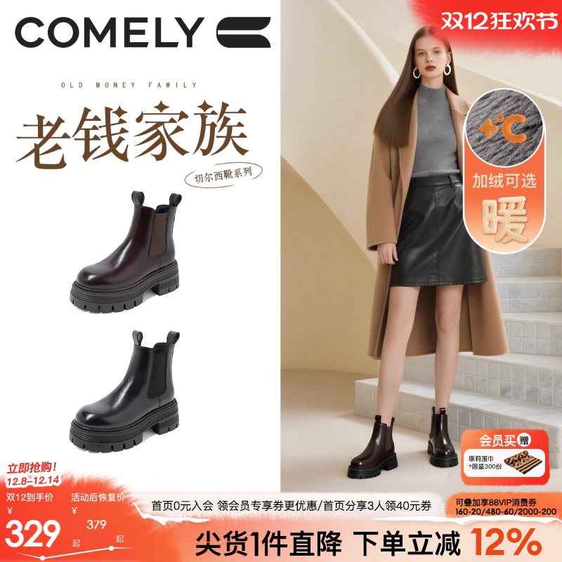 康莉厚底烟筒靴女秋冬女靴中筒增高加绒切尔西靴短靴靴子黑色靴鞋