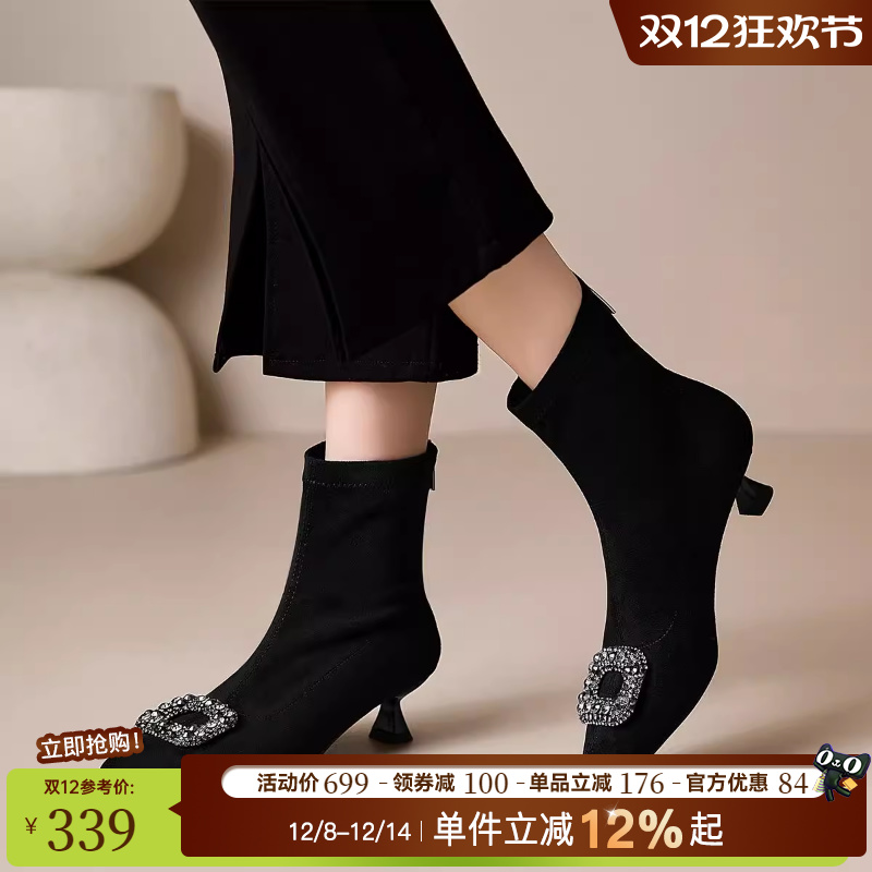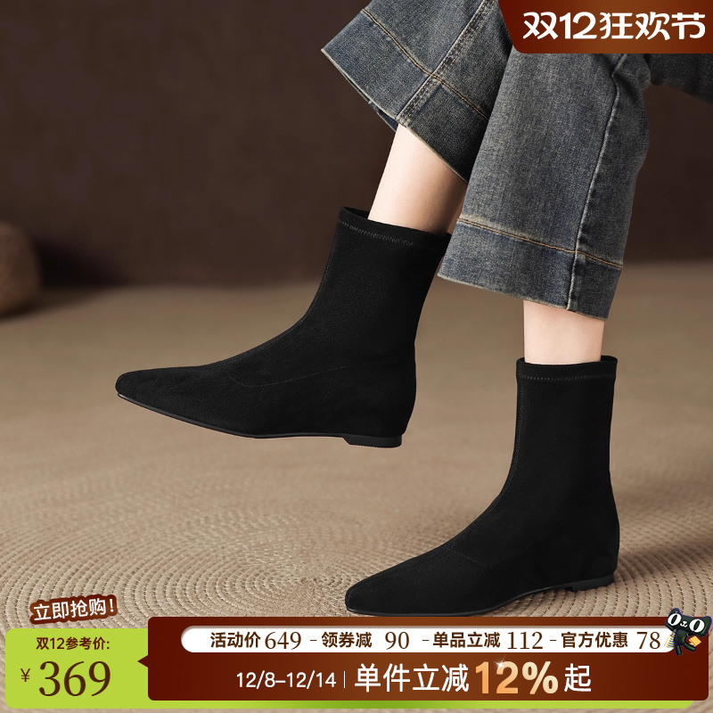 中筒靴女靴子秋冬季2025新款时尚百搭尖头短靴女高跟鞋绒面堆堆靴
