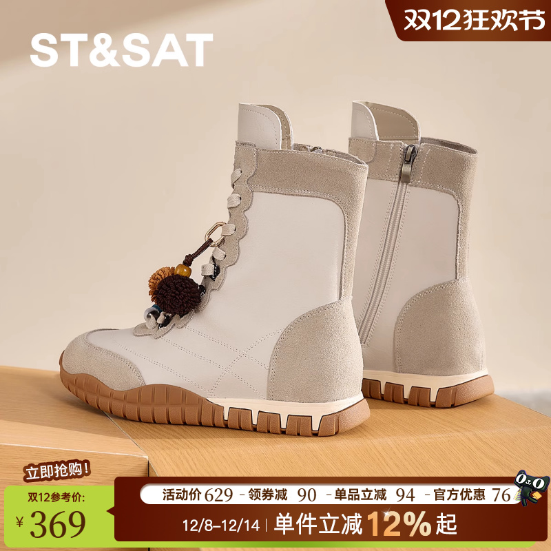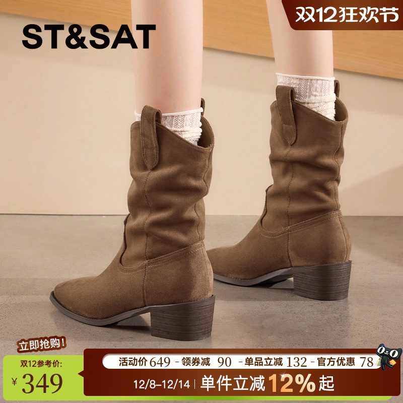 星期六2025秋季新款西部牛仔靴复古真皮女靴中筒短靴美拉德堆堆靴