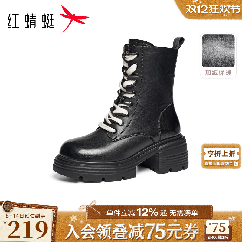 红蜻蜓马丁靴2025秋冬新款女鞋厚底系带中筒靴加绒保暖机车靴女靴