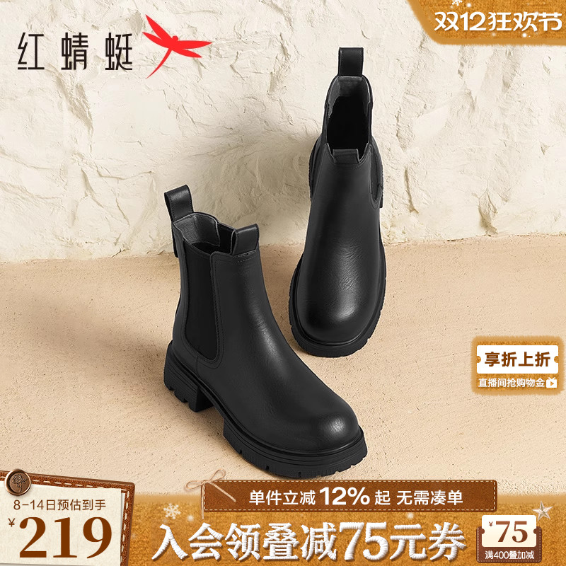 红蜻蜓厚底切尔西靴女款秋冬新款女靴烟筒靴短筒弹力靴粗跟中筒靴
