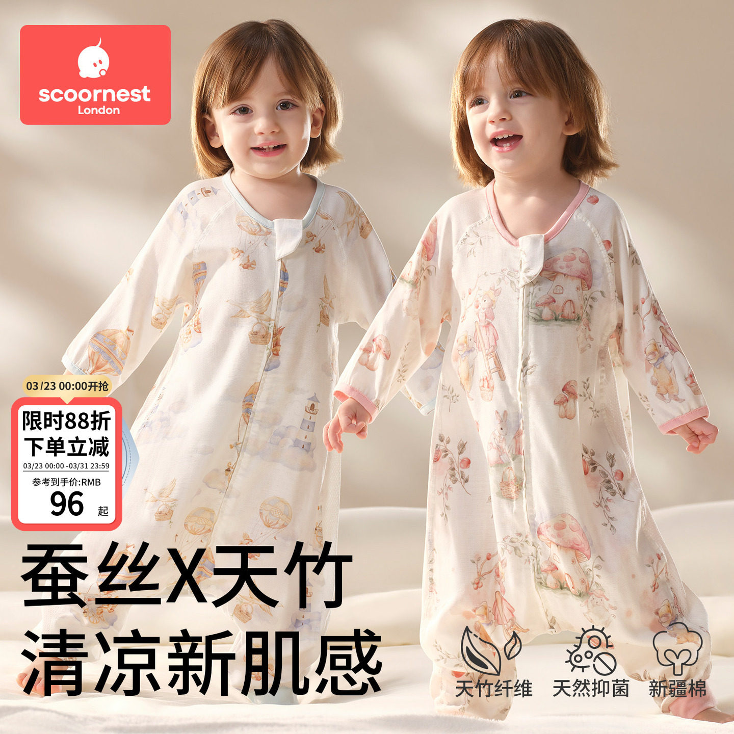科巢儿童连体睡衣七分袖女童男孩宝宝家居服衣春秋夏季薄款桑蚕丝