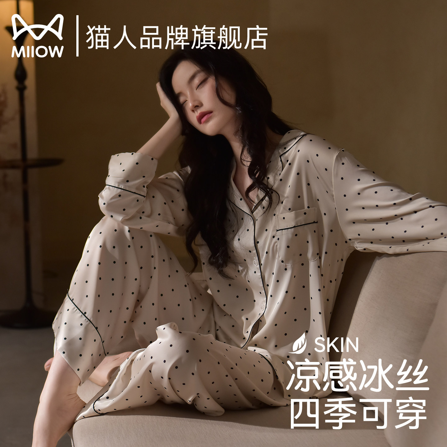 猫人冰丝睡衣女2026新款春夏季真丝薄款长袖宽松可外穿家居服套装