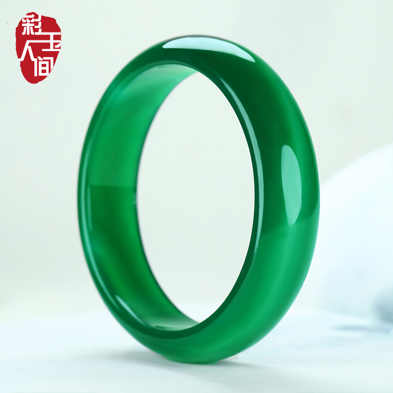 天然绿玛瑙手镯女冰种玉髓镯子祖母绿水晶宽条碧玉色民族风附证书