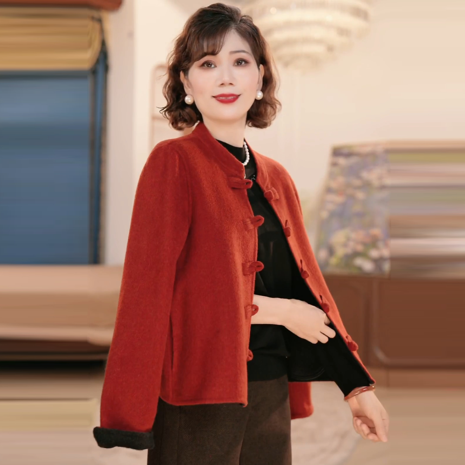 妈妈装双面呢子大衣时尚中国风毛呢外套秋冬中老年人复古盘扣上衣