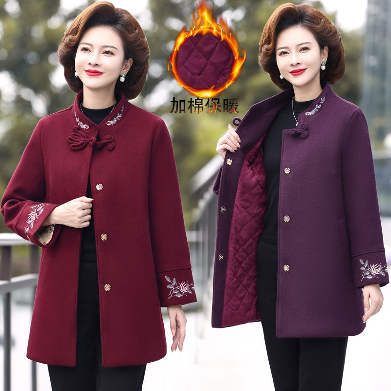 高档中老年女装冬装中国风中长款加绒加厚呢子大衣妈妈装毛呢外套
