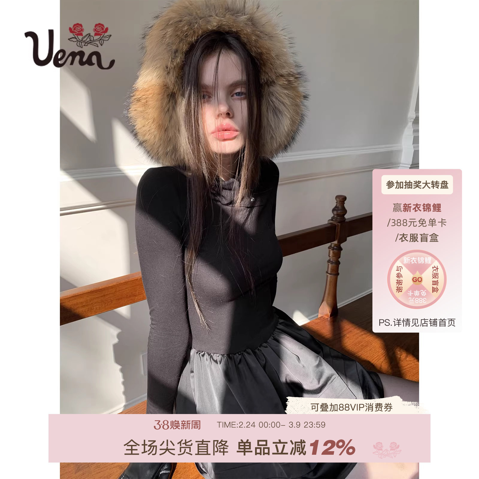 【迷迭庄园】Uena明星同款黑色堆堆领长袖拼接蓬蓬连衣裙附打底裤
