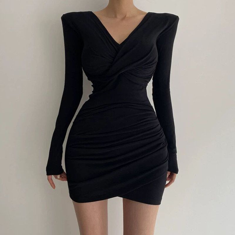 黑色性感v领长袖连衣裙2025新款女春秋打底内搭气质修身包臀短裙