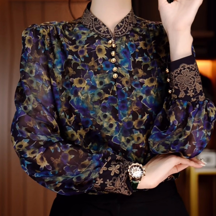 洋气紫罗兰印花立领妈妈秋季小衫2025新款显瘦长袖宽松套头上衣女