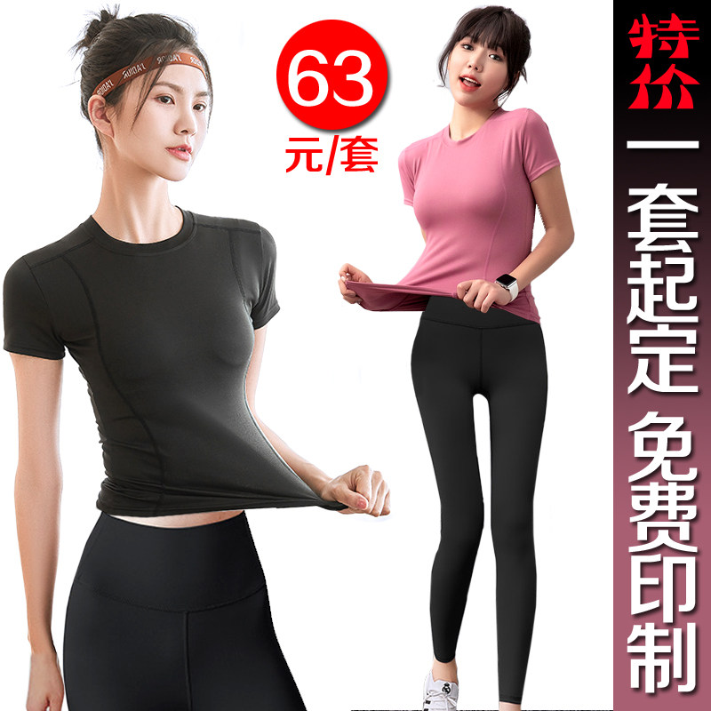 特价免费定制短袖T恤运动套装女瑜伽服修身衣长裤两件套印LOGO字
