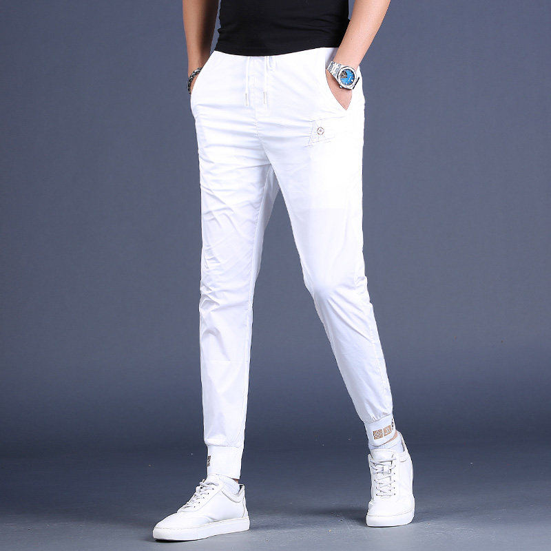 夏季薄款冰丝休闲裤男刺绣潮牌束脚裤男士九分弹力白色宽松运动裤