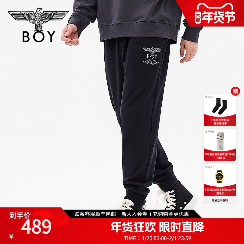 BOYLONDON男女同款长裤经典老鹰潮牌休闲黑色束脚裤N15803
