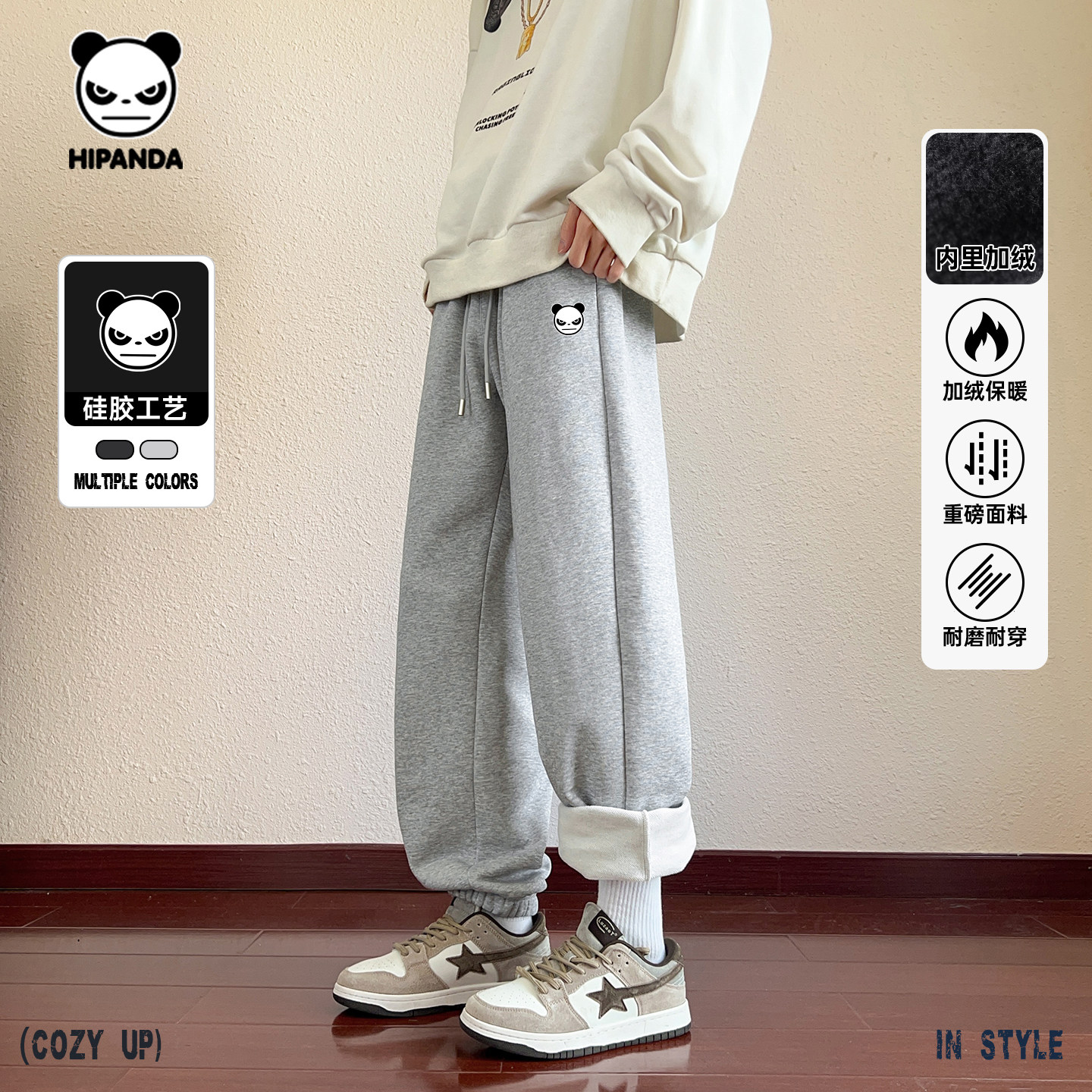 Hipanda你好熊猫重磅宽松运动裤束脚裤2025冬加绒潮牌针织卫裤男
