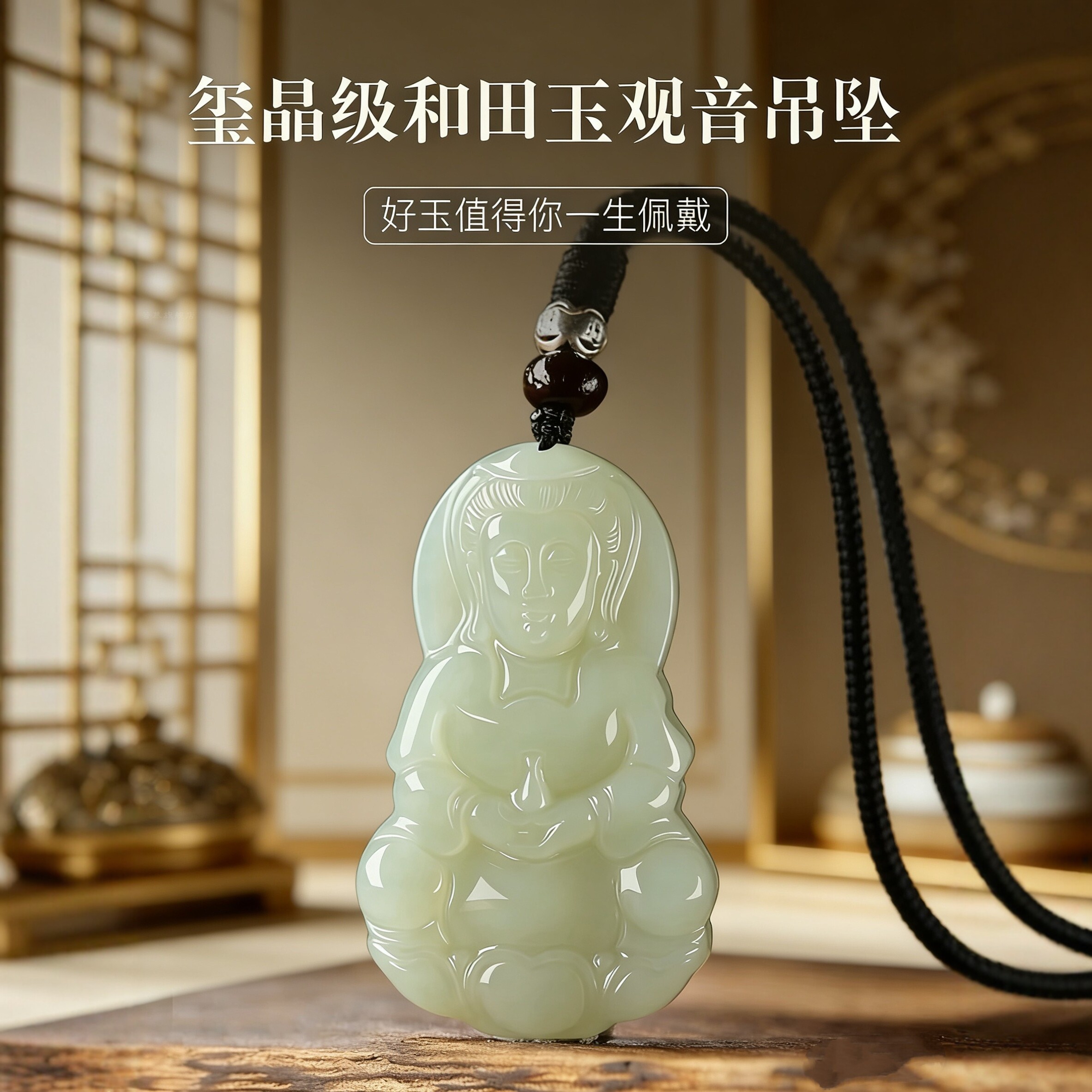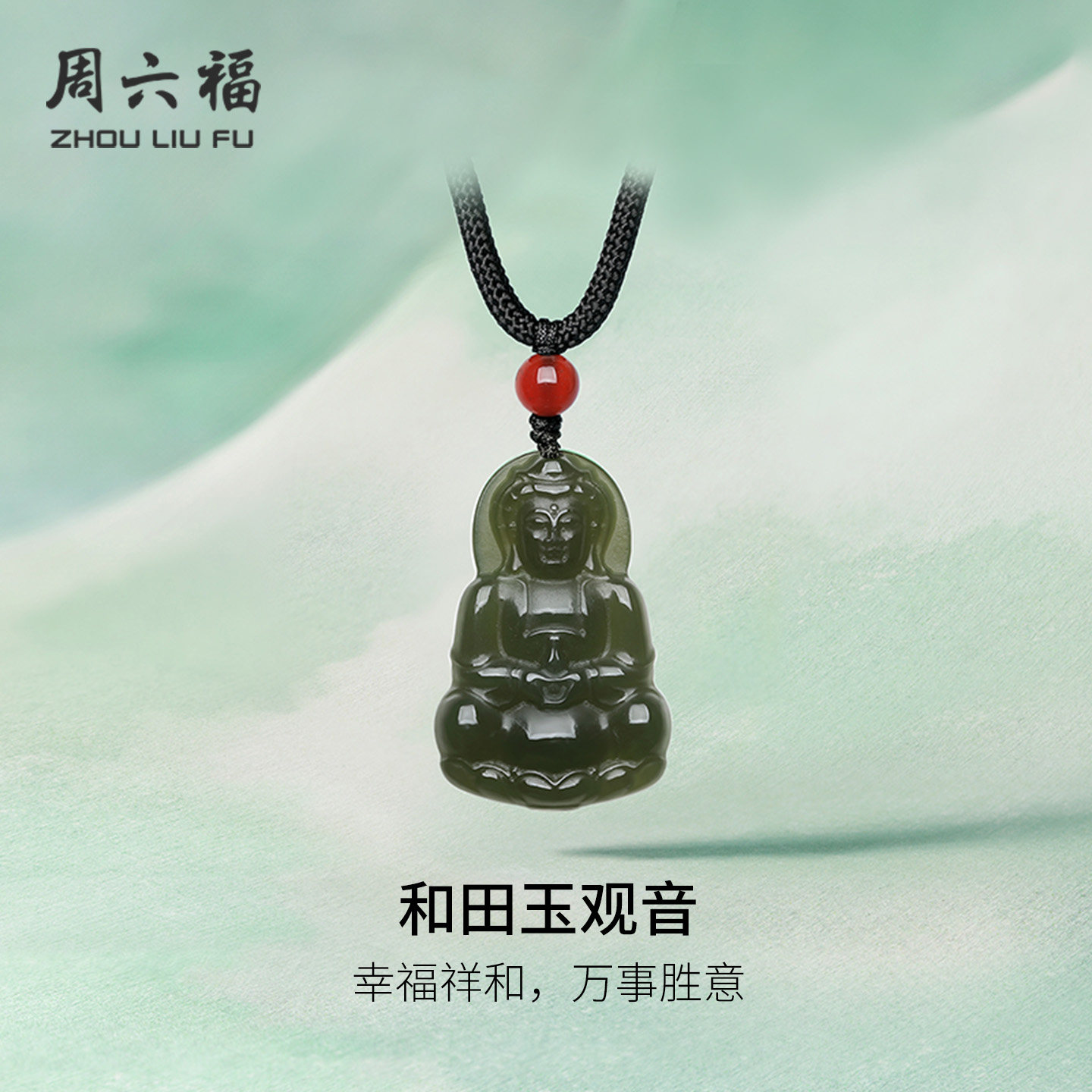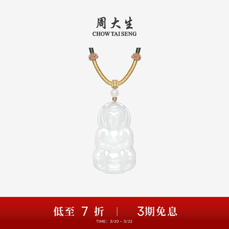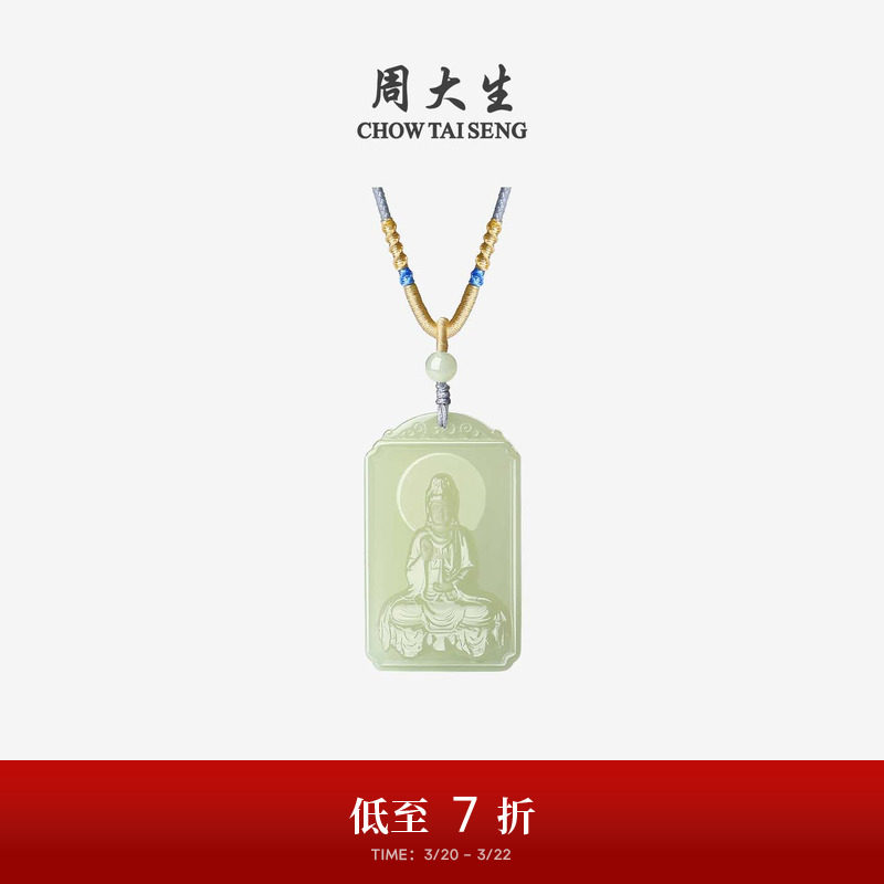 周大生和田玉吊坠男女白玉观音项链挂坠带编绳生日礼物送男女朋友