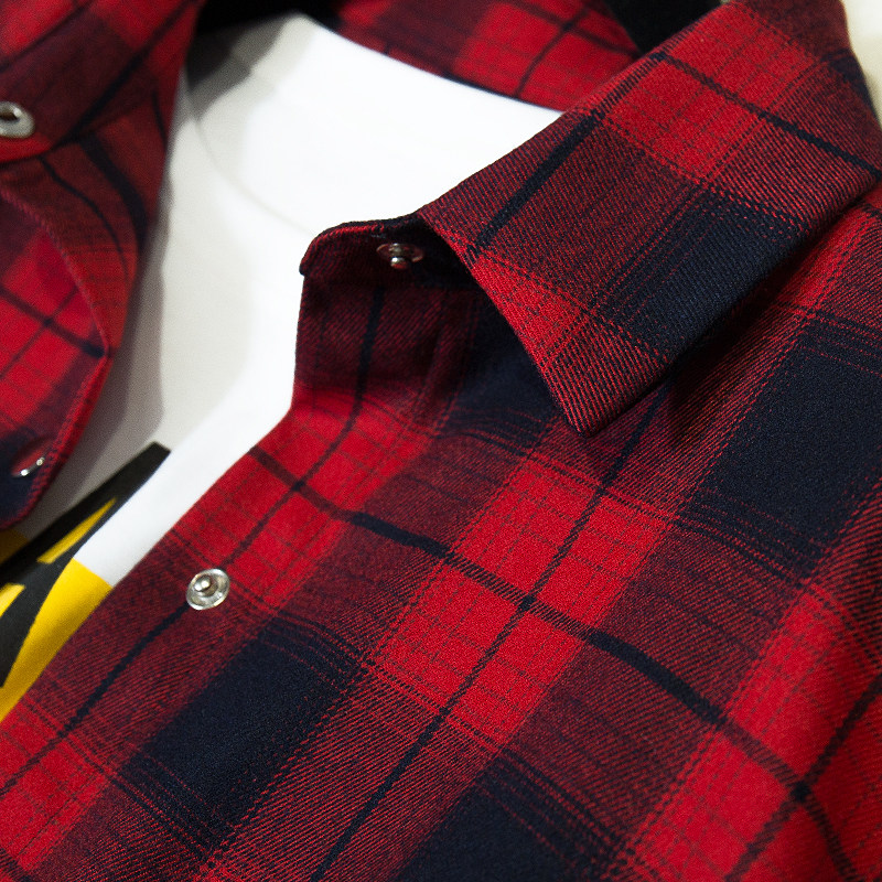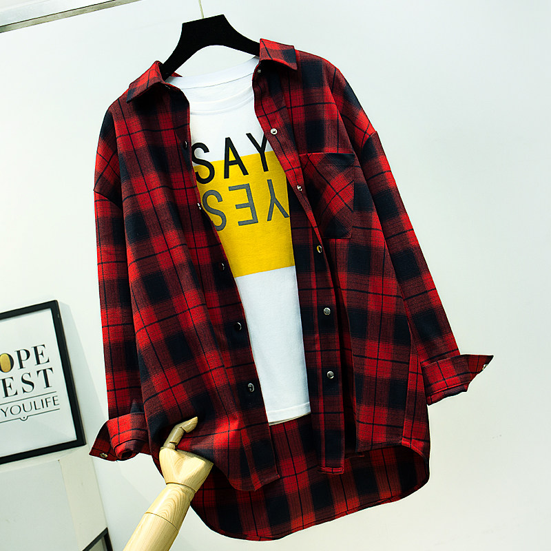 2023春秋格子衬衫女长袖中长款宽松外套休闲百搭加厚红黑衬衣磨毛