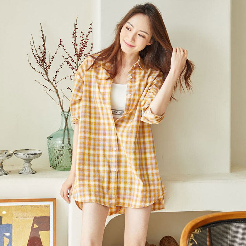 义深海懒懒搭高档纯棉格子衬衫女长袖中长款休闲时尚百搭衬衣潮款