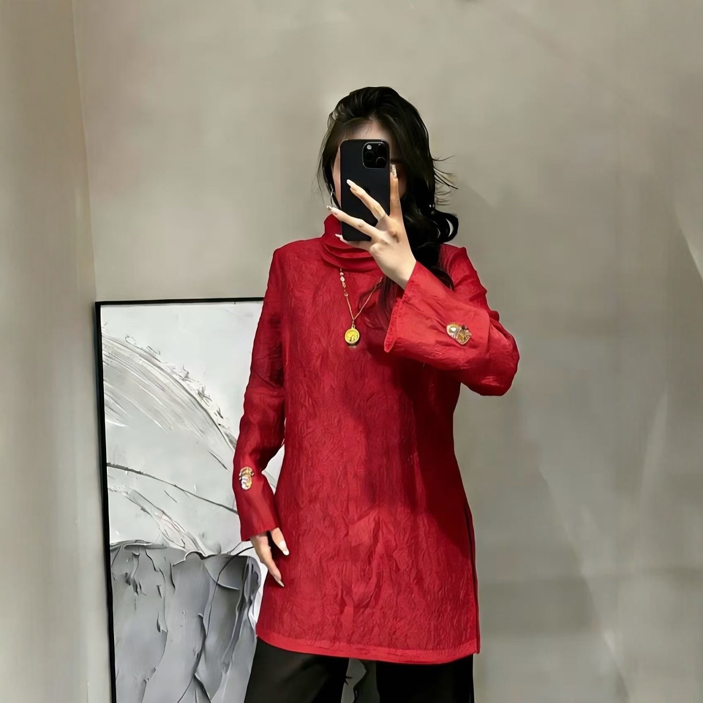 红馆2025秋季新款红色衬衫女长袖中长款衬衣韩系穿搭小资小上衣女