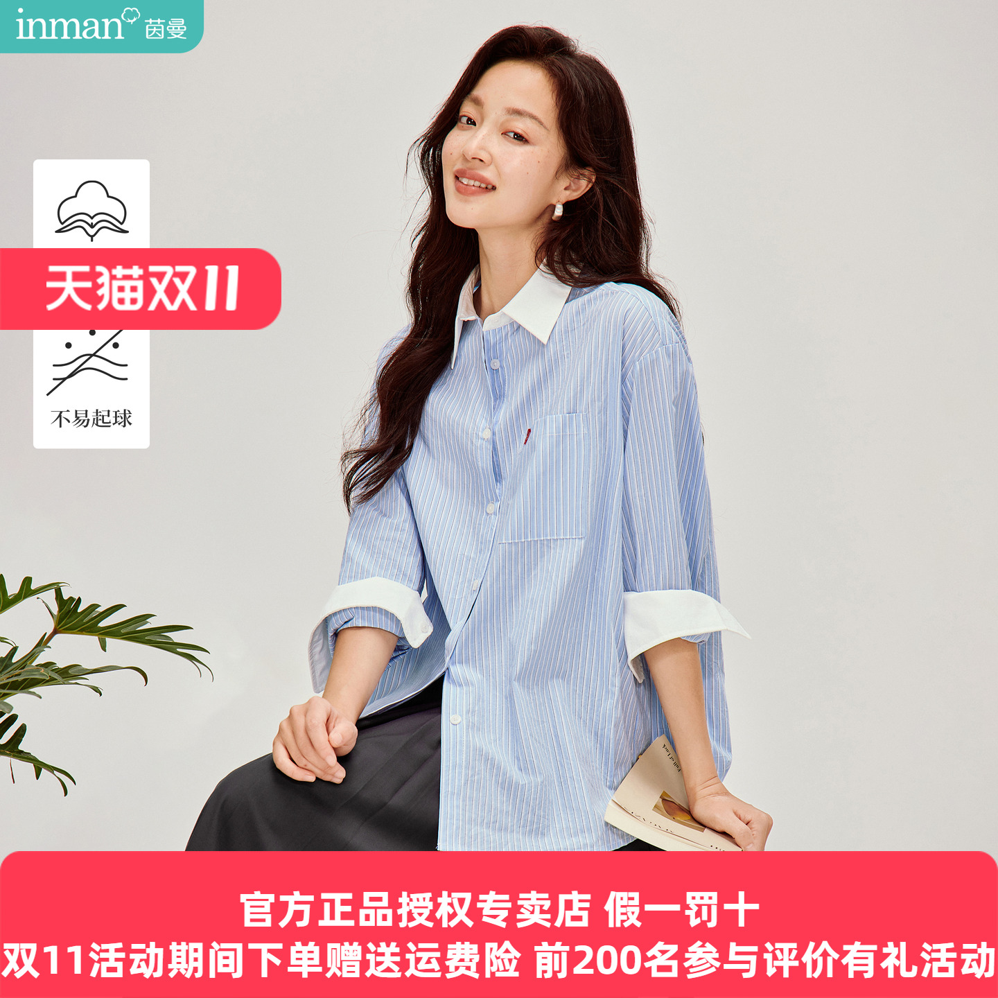 茵曼100棉府绸条纹印花贴布绣衬衫2026春季女装新款宽松长袖衬衣