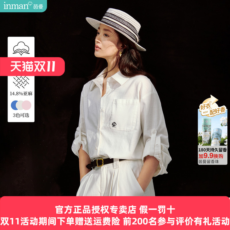 茵曼高智通勤亚麻棉刺绣花边白衬衫2026春季女装新款宽松长袖衬衣