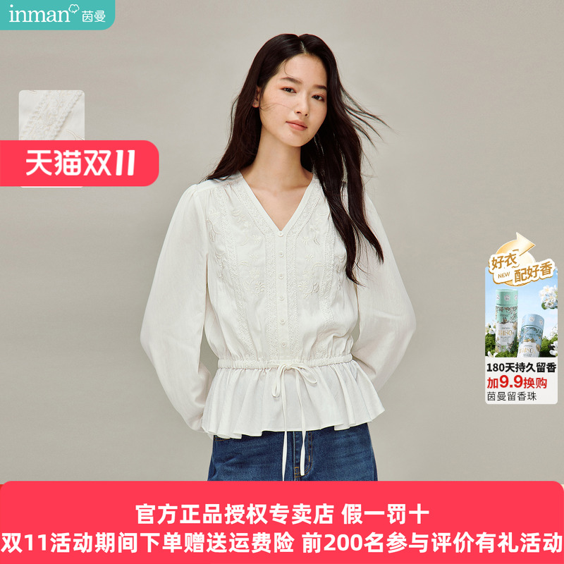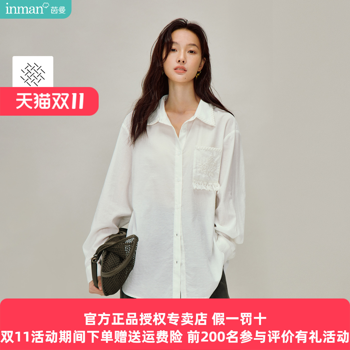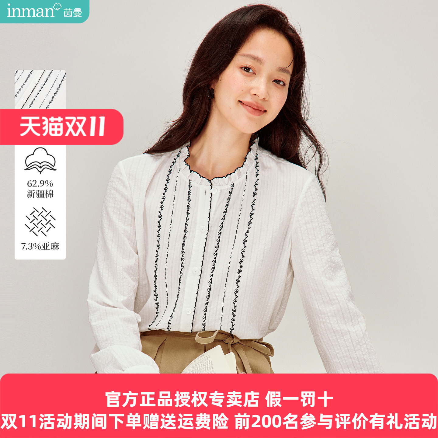 茵曼100棉甜美花边刺绣白色衬衫2025秋季女装新款长袖气质衬衣