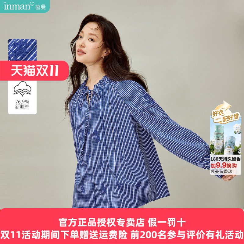 茵曼蓝格纹绣花木耳边系带衬衫2026春季女装新款宽松长袖娃娃衫