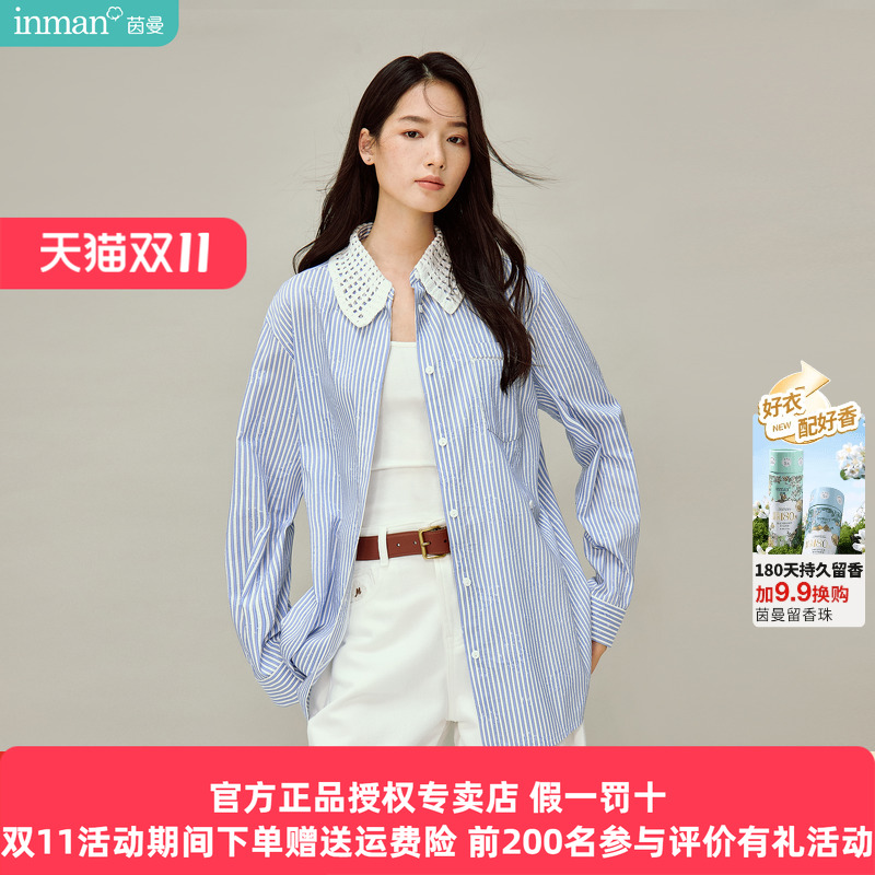 茵曼镂空钩花领拼接条纹衬衫2026春季女装新款宽松长袖气质衬衣